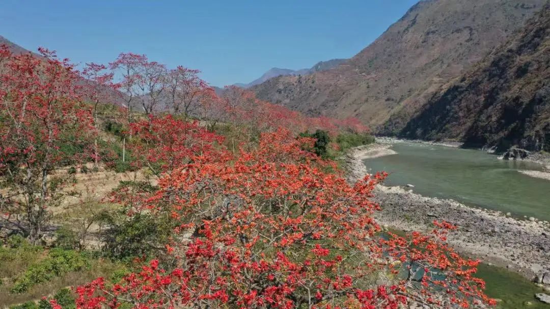 一路南行,潞江坝沿江的木棉花开出了一片满江红。