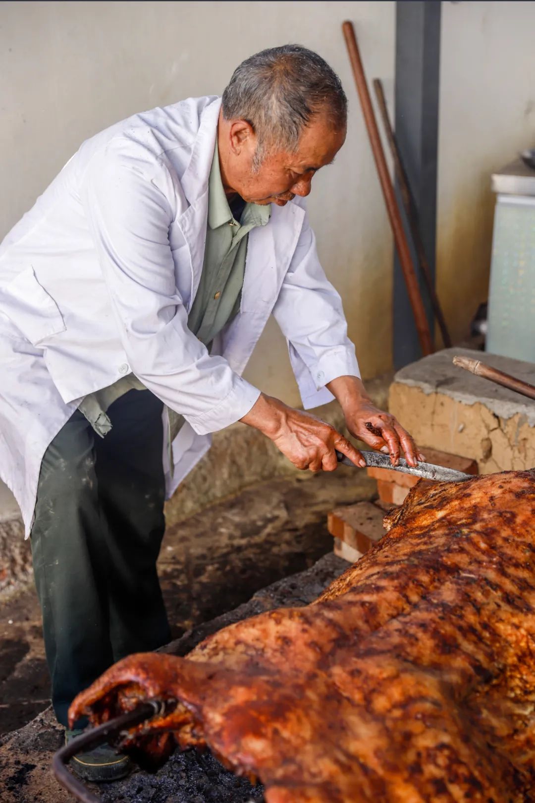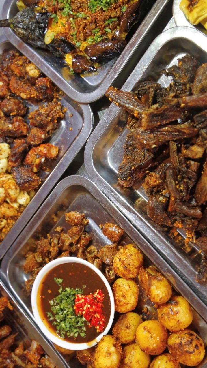 要说吃肉,河图大烧必不能少。真正的河图大烧是得用整猪烤制,半膘猪屠宰洗净开膛,栗炭火去尽表皮水分,扎针后,再撒上酱汁调料,刮糊,如此反复,直至猪皮糊焦起酥。