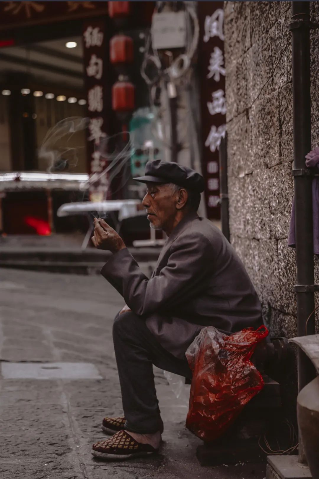 老人点一支旱烟,坐在街口,缓缓抽一口,吐出的烟雾在冬日懒洋洋的光线里散落开。