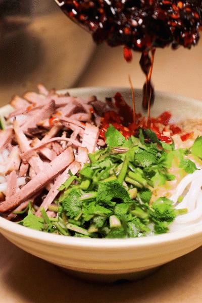 拌的时候再配上火烧肉,撒上花生与芝麻,再搭配辣椒、香菜、酱油与醋,一场味蕾的狂欢就此开始。