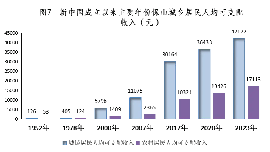 城乡居民收入大幅提高。城镇居民人均可支配收入由1952年的126元提高到2023年的42177元,增长334倍,年均增长8.5%;农村居民人均可支配收入由1952年的53元提高到2023年的17113元,增长322倍,年均增长8.5%。居民食品消费需求转向质的提升,2023年城镇居民家庭恩格尔系数为28.5%,比1986年的49%下降20.5个百分点;农村家庭恩格尔系数为28.7%,比1985年的80.5%下降51.8个百分点,居民恩格尔系数的下降,标志着居民生活水平的进一步提高,居民消费已从仅仅满足温饱转向品质追求,食品消费也由单纯填饱肚子转向营养、健康的饮食搭配,人民生活水平质量全面提高。