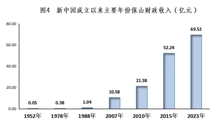 财政实力日益增强。新中国成立初期,百废待兴,财政基础十分薄弱,1952年体育买球手机网址地方财政收入仅有0.05亿元,1978年也只增加到0.38亿元,随着改革开放步伐的加快,体育买球手机网址的经济实力显著提升,财政收入实现快速增长,至1988年突破亿元关口,达1.04亿元,2007年突破10亿达10.58亿元,2010年突破20亿元达21.38亿元,2015年突破50亿达52.24亿元。2023年财政收入达69.52亿元,增长27.3%,是1952年的1390倍。为促进经济社会发展、改善人民生活水平提供了有力的资金保障。