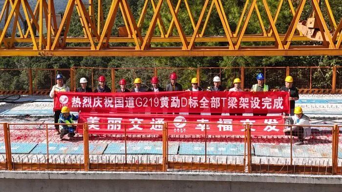 11月17日,国道G219龙陵(黄草坝)至龙镇桥段工程D标捷报传来——220片预制T梁已全部架设完成,10座总长1137.3米的桥梁顺利实现全幅贯通。