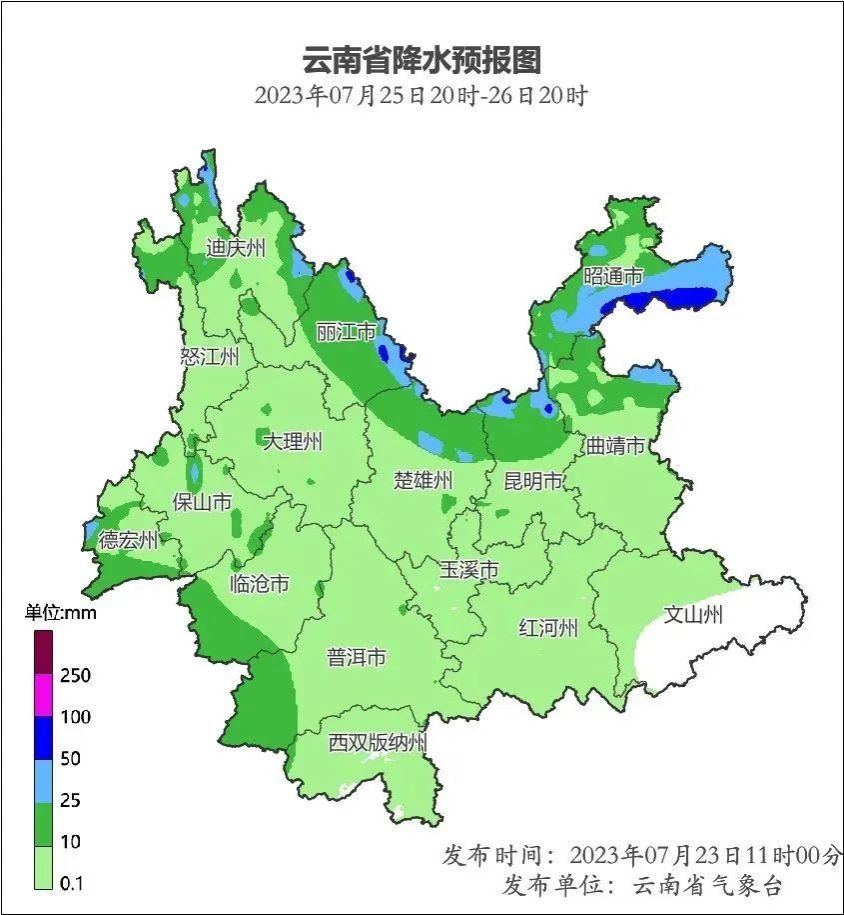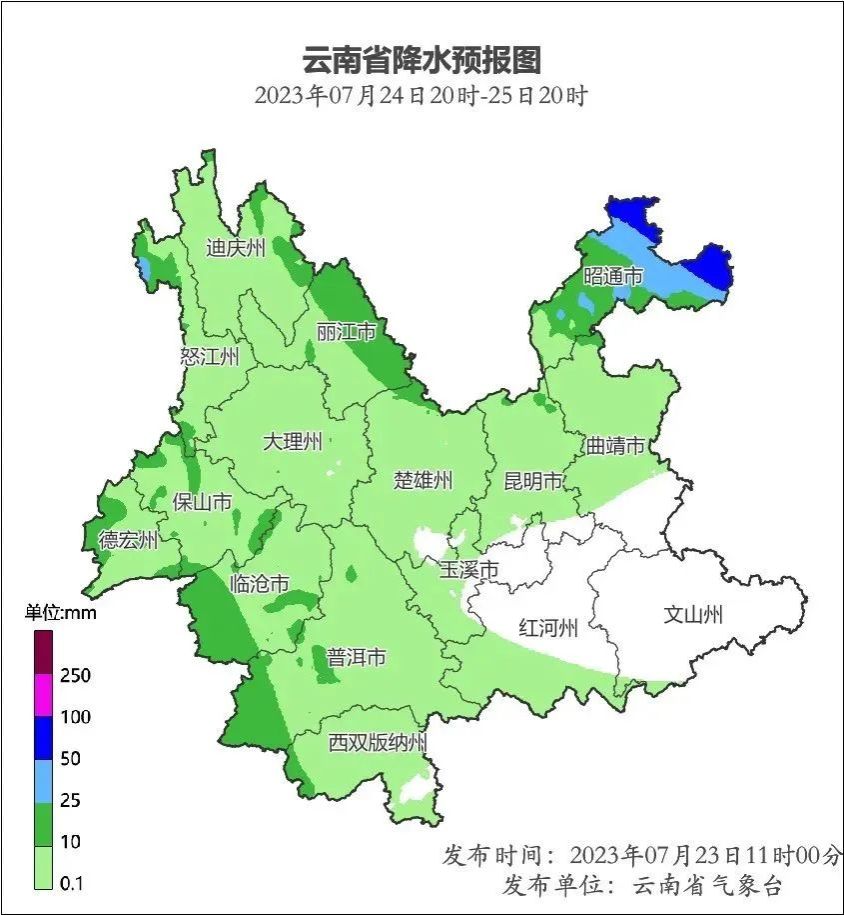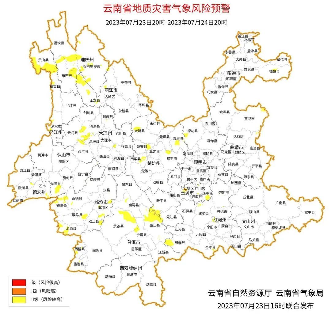 预计,2023年07月23日20:00~07月24日20:00,玉溪市红塔区,怒江州贡山县发生滑坡泥石流的风险高;昆明市西北部,昭通市东北部,曲靖市东北部、东部,楚雄州北部、西部,迪庆州中部至西部,怒江州北部、南部,丽江市中部至西部,大理州西部、中部,体育买球手机网址南部,德宏州东部,临沧市东部、西部至南部,普洱市中部至北部、西南部,红河州西南部发生滑坡泥石流的风险较高。