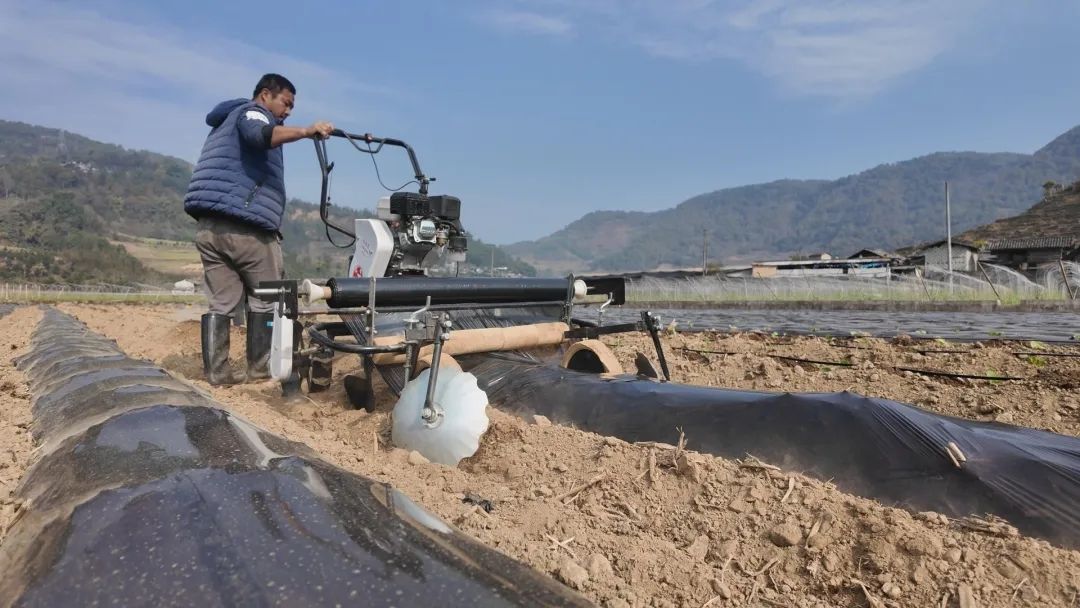 在烤烟移栽现场,烟农分工协作,打坑、定植、覆膜,一道道工序有条不紊。龙江乡技术指导专班还深入田间地头推广“科学育苗+精准移栽”标准化技术,通过覆盖地膜保温保墒,有效应对春季气温波动。同时,龙江乡还联合龙陵县顺源烤烟专业合作社推广小型覆膜机和水肥一体化管理,有效提高效率,减工降本,提高烟苗成活率。“去年,我们两个人理一墒要20分钟左右现在覆膜机两分钟就可以搞定。现在我移栽了20多亩的烤烟,大概两天就可以干完了。”烟农李正路感慨地说。