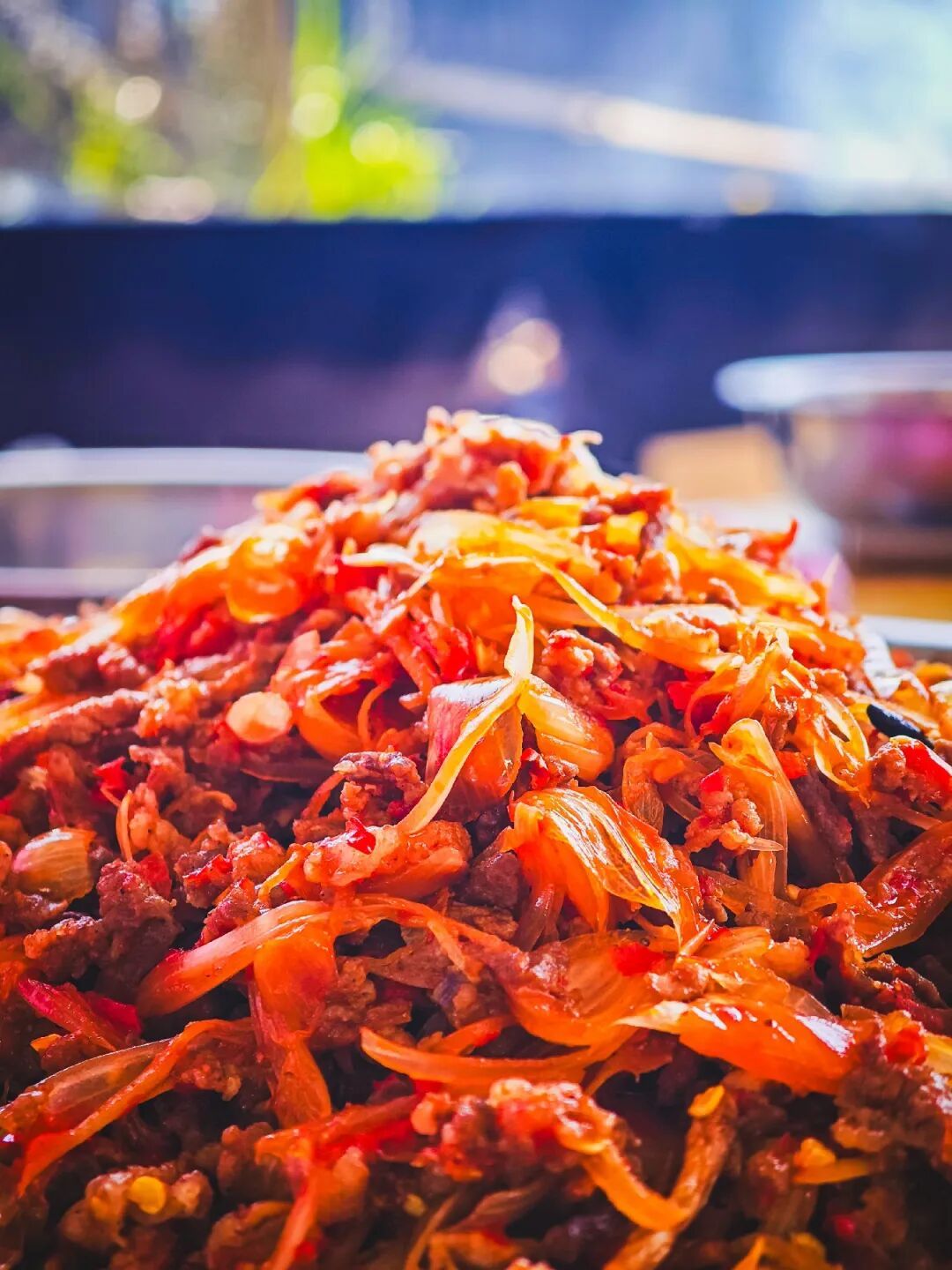 农家自制的藠头鲊脆嫩多汁,搭配新鲜猪肉爆炒,成就了这道咸香下饭的藠头炒肉。热油下锅,猪肉煸炒出香,加入藠头鲊快速翻炒,藠头的辛辣与鲜肉的醇香相互融合,是年猪饭里的“下饭神器”。