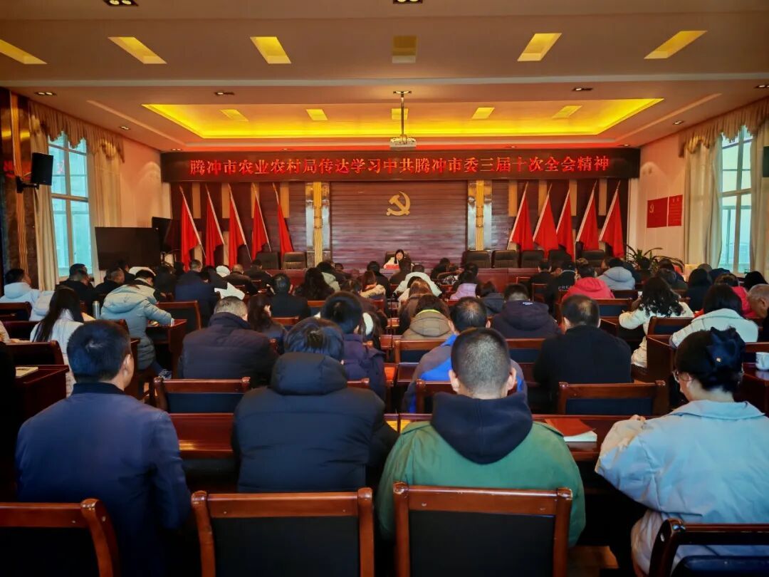 腾冲市农业农村局组织召开专题会议,动员全体干部职工以务实举措推动全会精神在农业农村领域落地生根、开花结果。会议要求,要锚定全会确定的目标任务,坚持科技兴农、绿色兴农、质量兴农、品牌强农协同推进,着力构建多元化食物供给体系,持续筑牢农产品质量安全防线,推动农产品加工业提质增效,深化“粮头食尾”“畜头肉尾”“农头工尾”全产业链价值转化,全力推动农业向现代化大产业跨越升级。