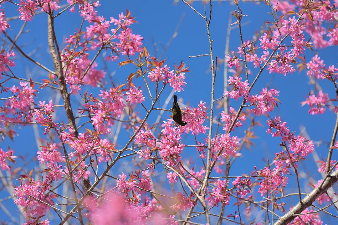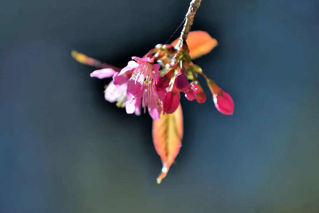 如果说斑斓的叶是大自然遗失在冬日里的秋意,那么早开的云南山樱就是早来的春天。进入天堂山范围,一路上都会收获许多意外之喜——路边已有冬樱花初开放,几棵早开的已开出一树诗情画意,让人不禁感慨匆匆又是流年。更多的,已是满树红红的花蕾,等待冬日寒霜唤醒。