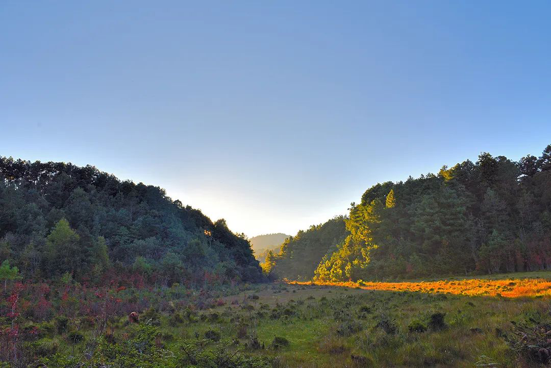 天堂山秋色最美的,要数东侧的高山湿地。当千亩草甸穿上了黄色衣裳,周围的树叶呈现出缤纷的色彩,与蓝天白云连在一起,构成一幅色彩丰富、层次分明、相得益彰的山水画。