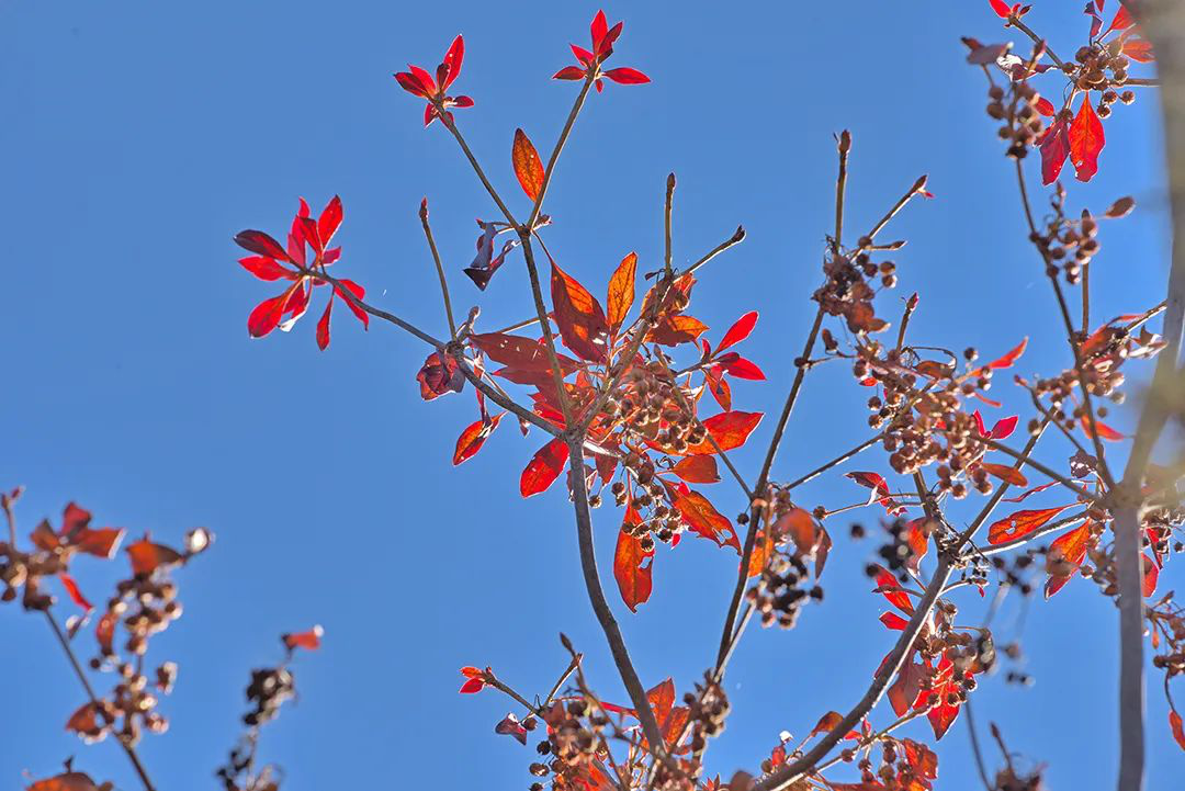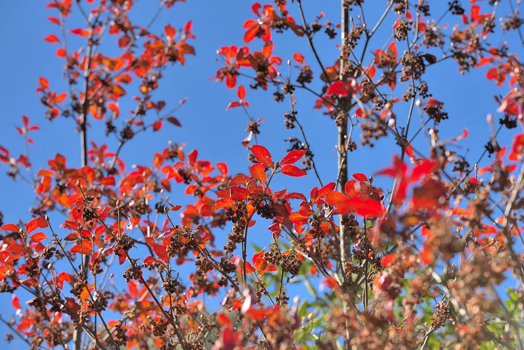 小雪前后的几场风,加速了红叶的凋落速度,但这并不影响观叶的效果,稀稀疏疏的红叶,在冬日暖阳下如火苗在燃烧,与湿地里的小草、小花、小蝶一起变成了美丽的精灵,和着微风吹出的节拍,舞动出一个童话世界。